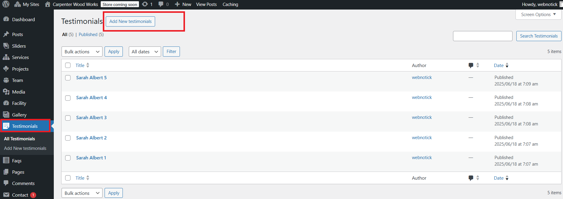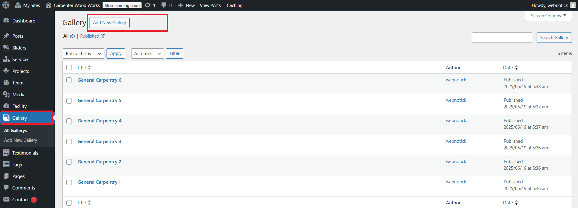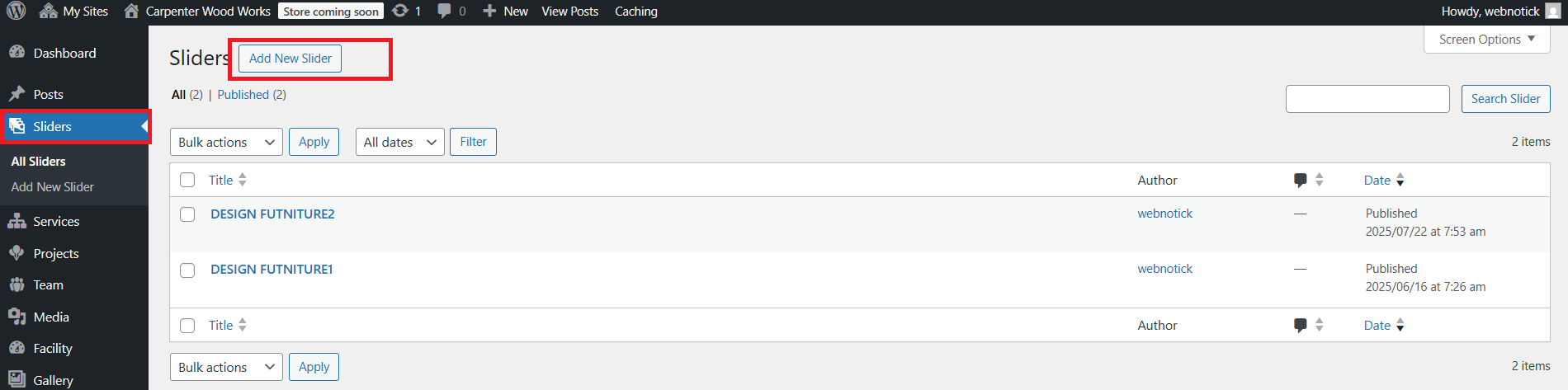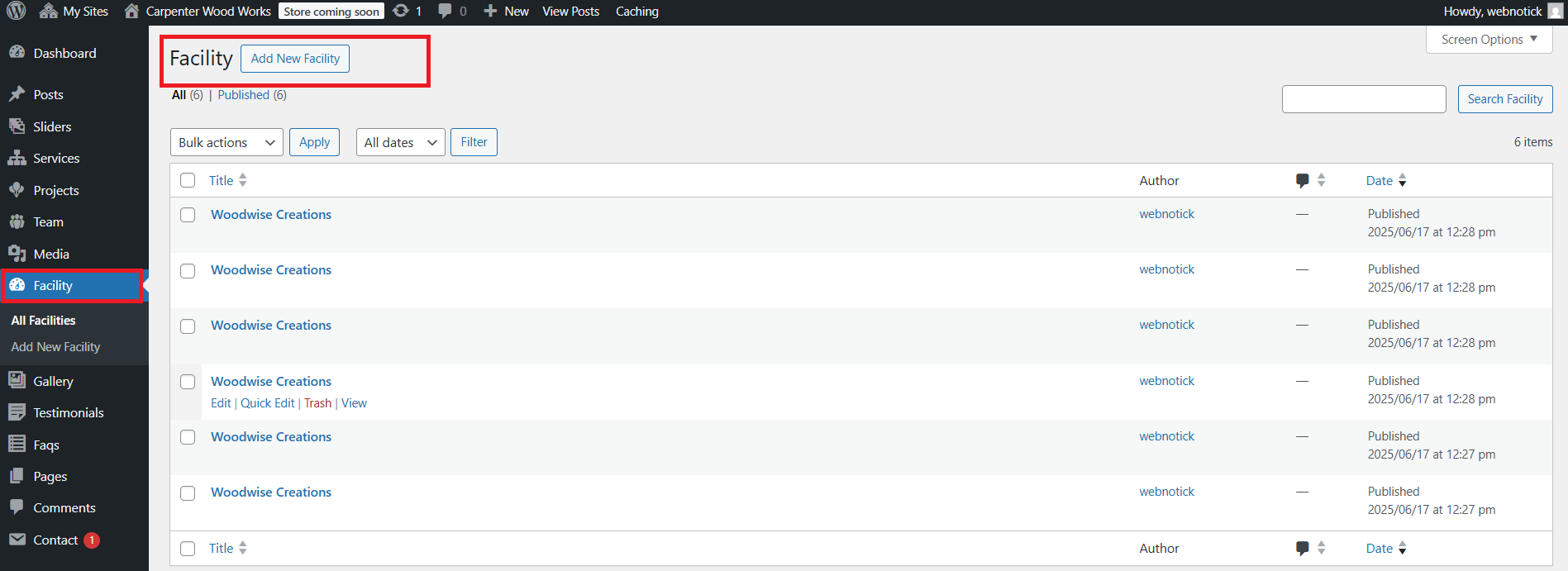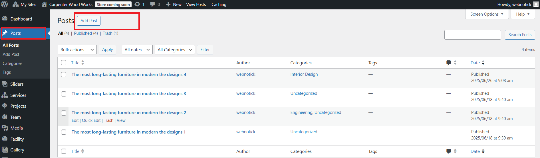 5. If you are not able to see the posttypes then you have to manually active the "Carpenter Wood Works Pro Posttypes" by going in to the plugins option.