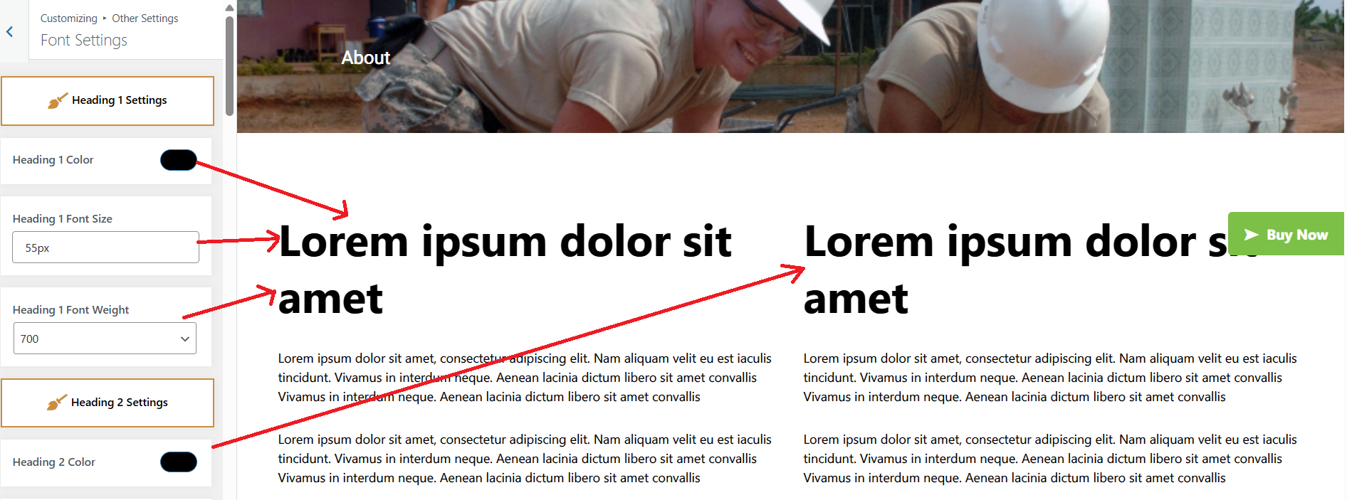 The method of changing the color or font is quite simple. You can easily change the color and font of headings (h1, h2, ... h6), paragraphs (p), and buttons with just a few clicks.