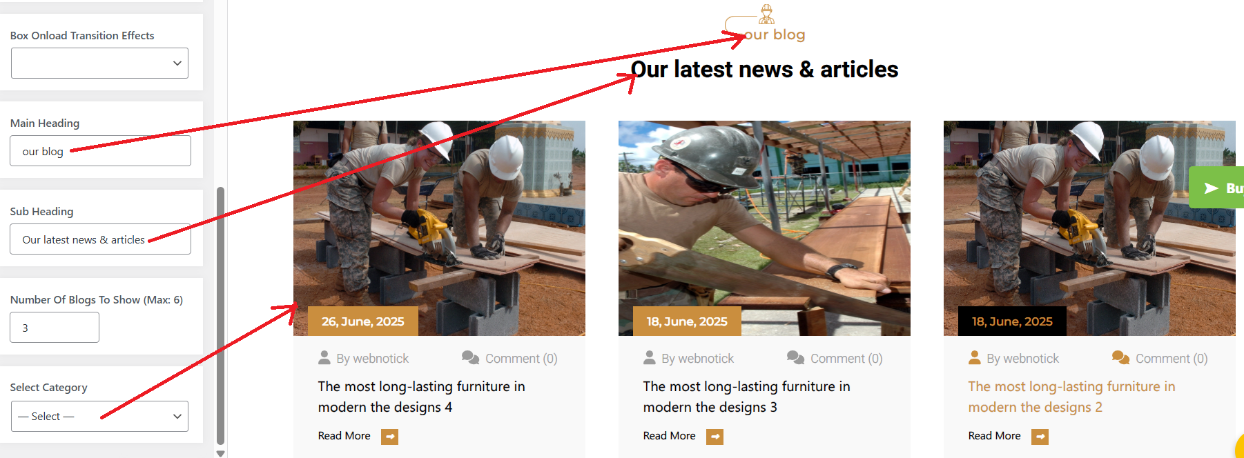 In this area, you can customize the slider's image, title, and description. You can also adjust the number of slides you want. Additionally, options are available to change the font family, font weight, font size, and colors of the headings and subheadings. You can also configure the navigation arrows and select the number of slides you prefer.