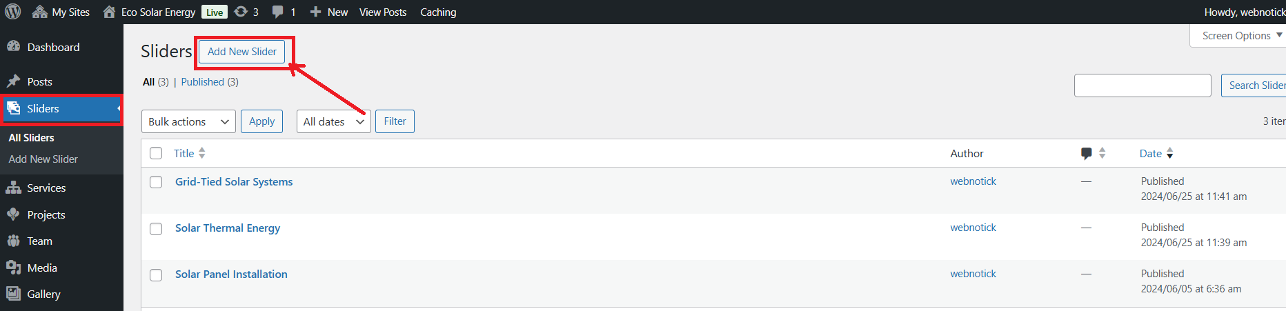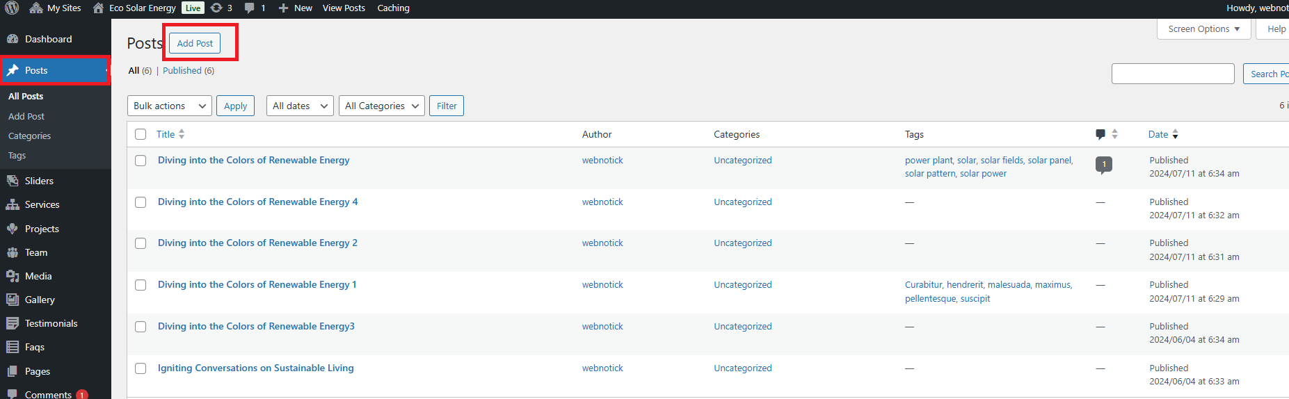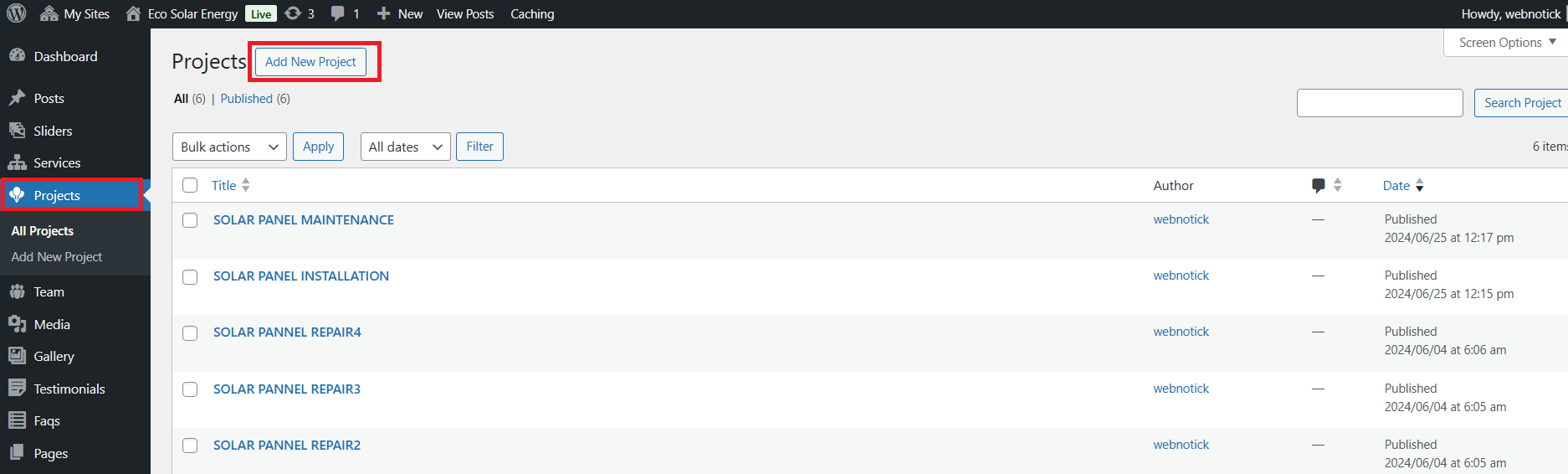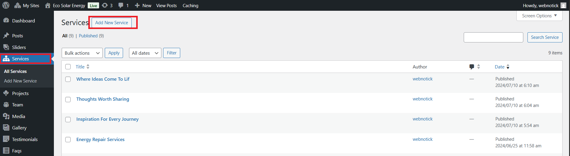 5. If you are not able to see the posttypes then you have to manually active the "Eco Solar Energy Posttypes" by going in to the plugins option.