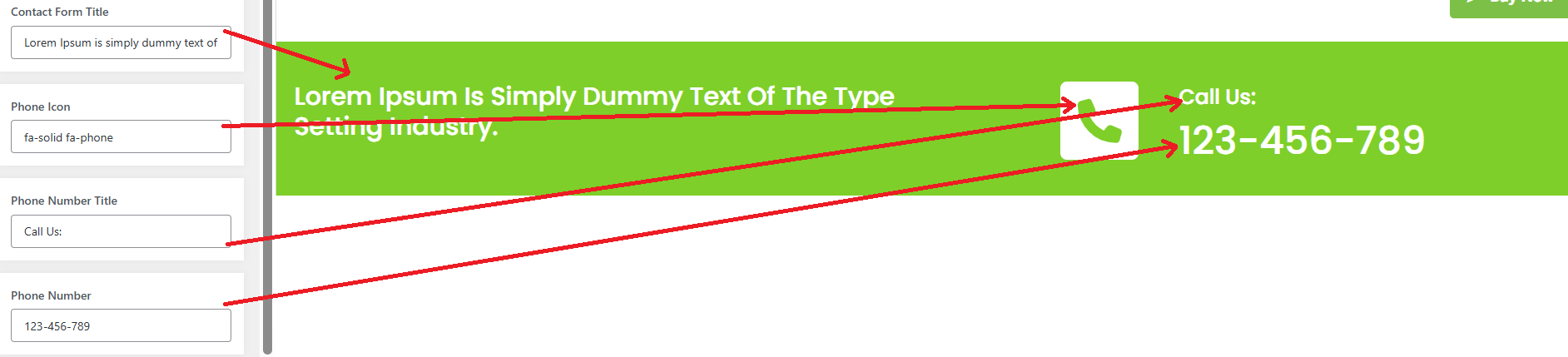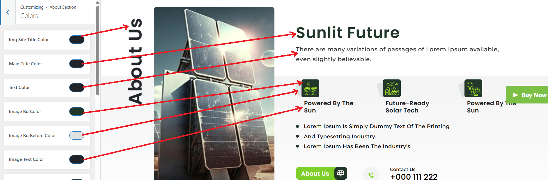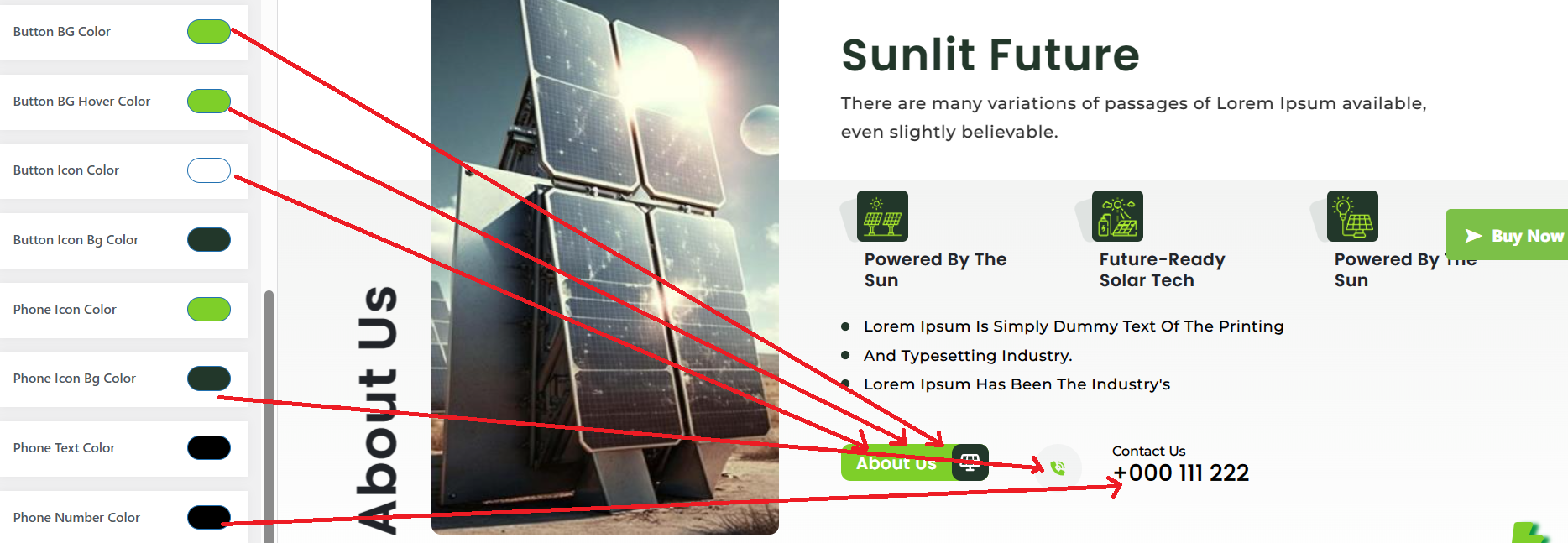 Depending on the available options in each area, you can change the color scheme for the headings, title/text, paragraphs, button text, and button background.