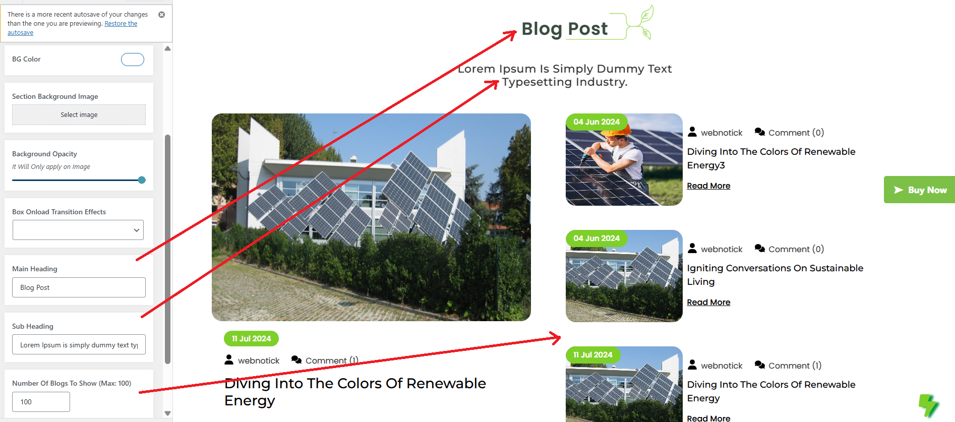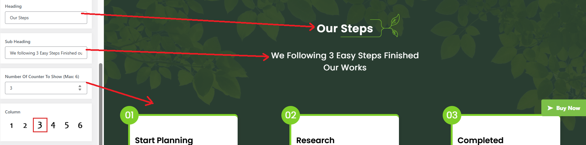 In this area, you can customize the slider's image, title, and description. You can also adjust the number of slides you want. Additionally, options are available to change the font family, font weight, font size, and colors of the headings and subheadings. You can also configure the navigation arrows and select the number of slides you prefer.
