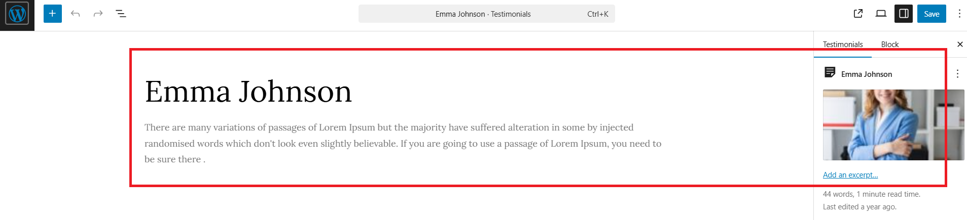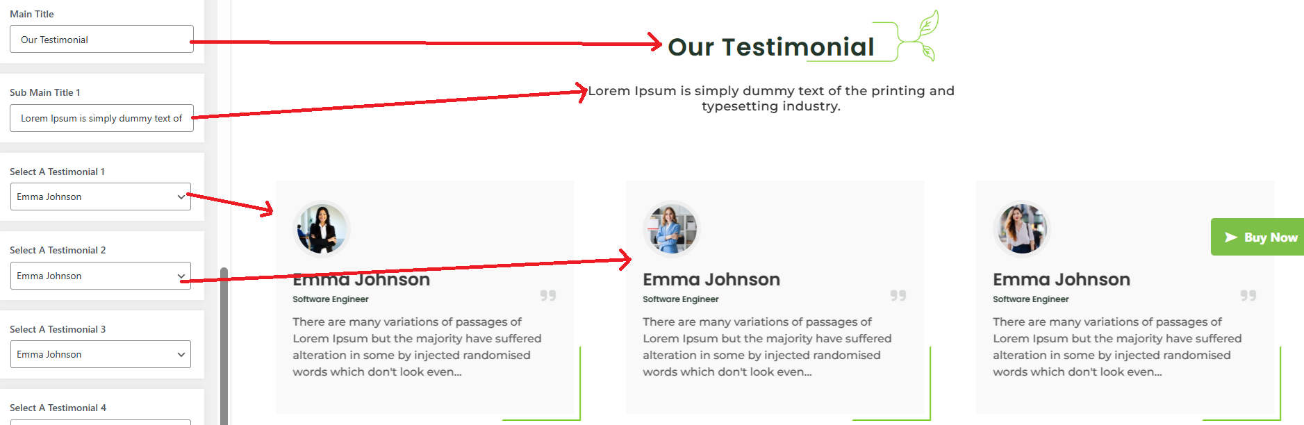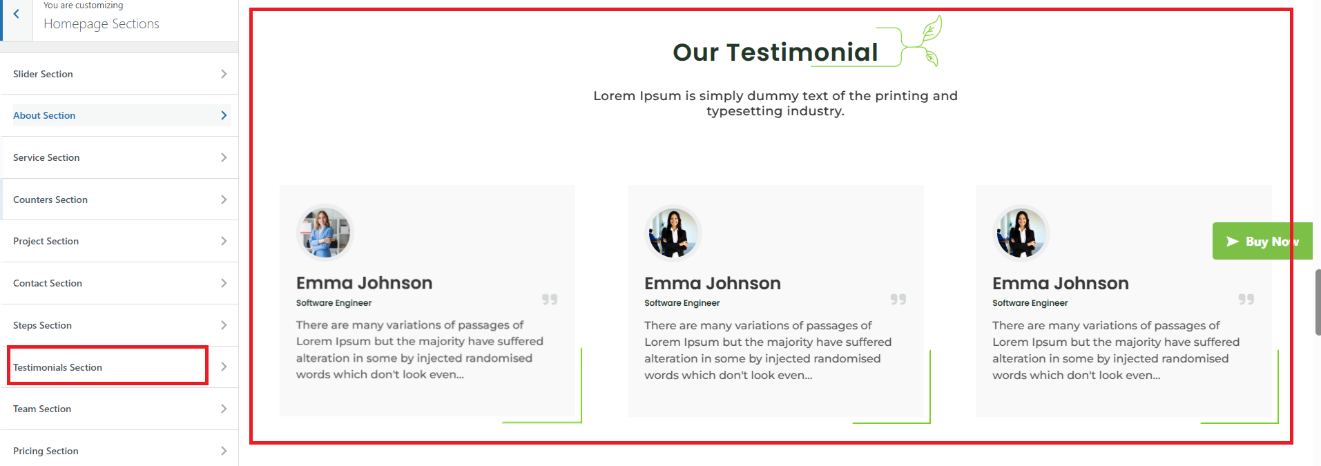 The following sections are included in the Testimonial Section customization: