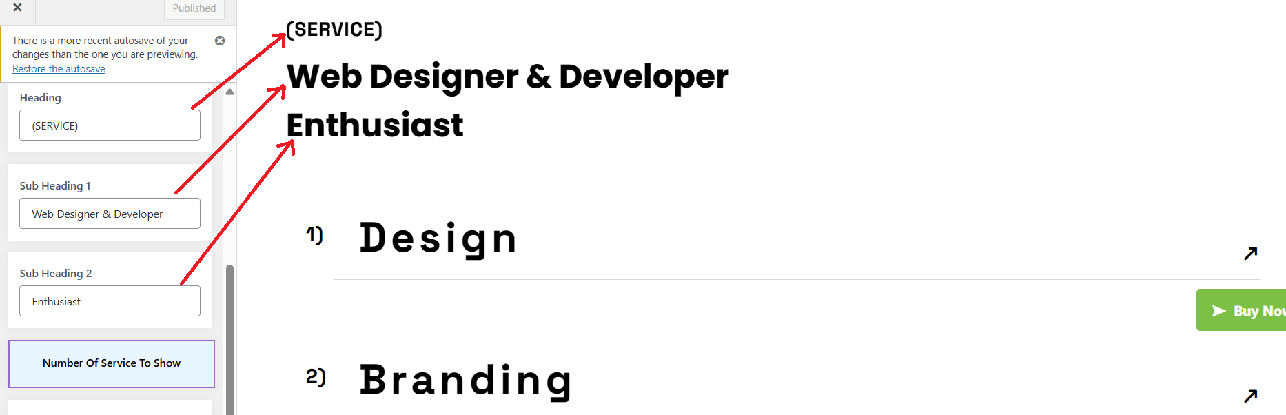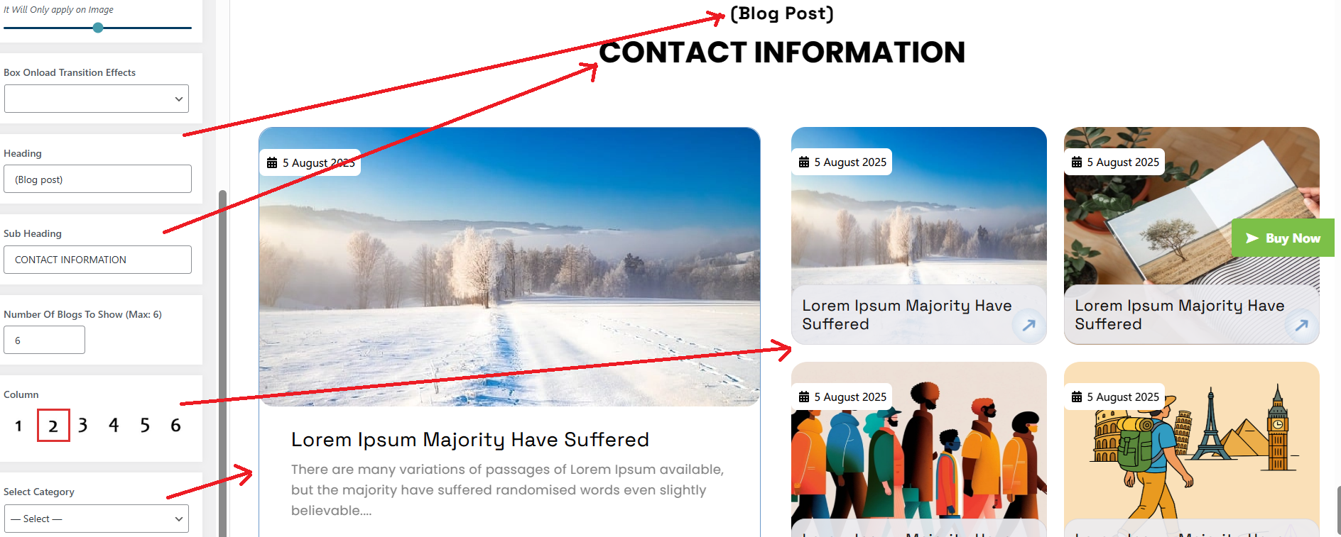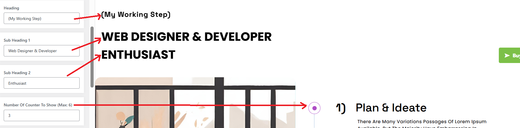 In this area, you can customize the slider's image, title, and description. You can also adjust the number of slides you want. Additionally, options are available to change the font family, font weight, font size, and colors of the headings and subheadings. You can also configure the navigation arrows and select the number of slides you prefer.