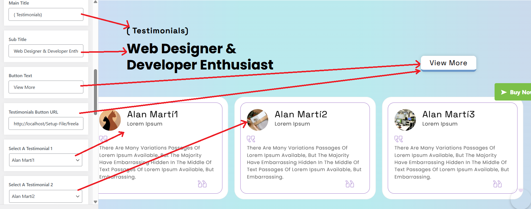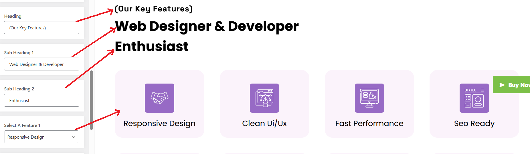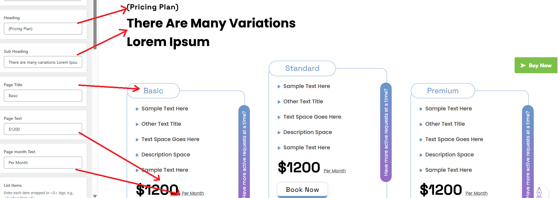 In this area, you can customize the slider's image, title, and description. You can also adjust the number of slides you want. Additionally, options are available to change the font family, font weight, font size, and colors of the headings and subheadings. You can also configure the navigation arrows and select the number of slides you prefer.