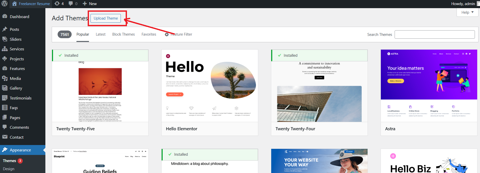 4. Select your Freelancer Resume Pro theme by clicking the Browser button, and then click on install button.