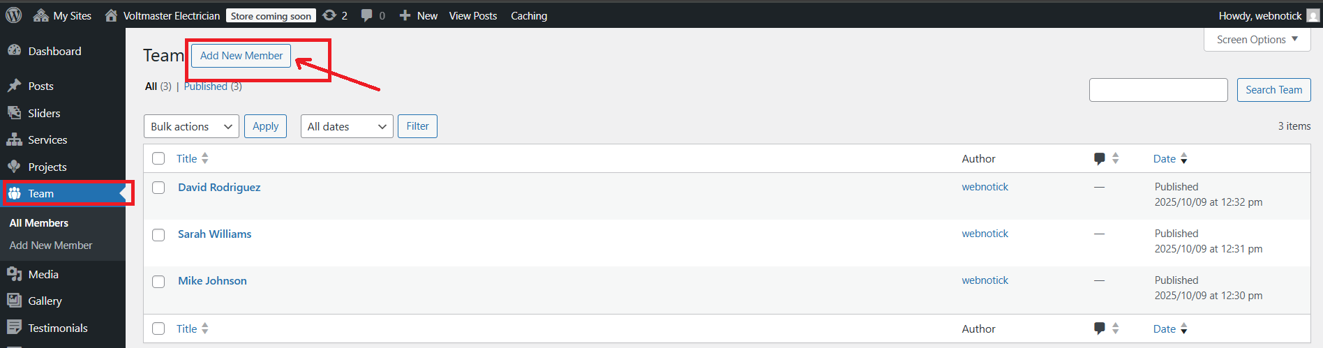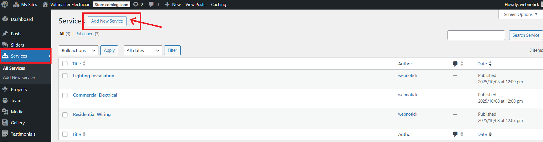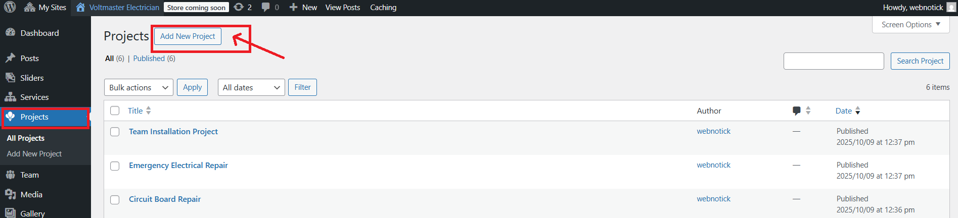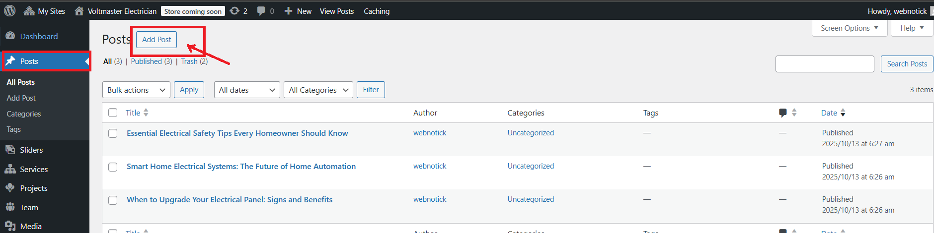 5. If you are not able to see the posttypes then you have to manually active the "Voltmaster Electrician Posttypes" by going in to the plugins option.