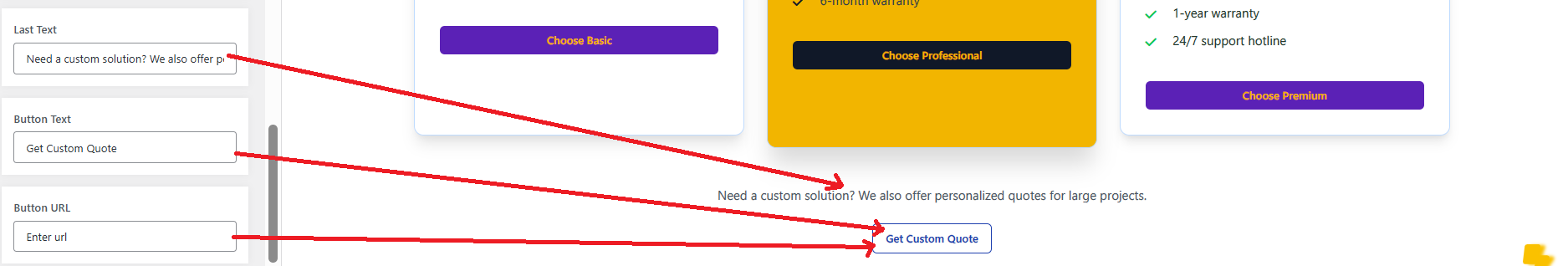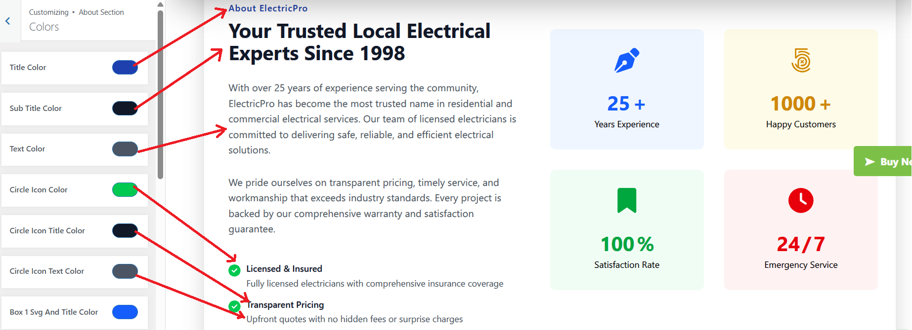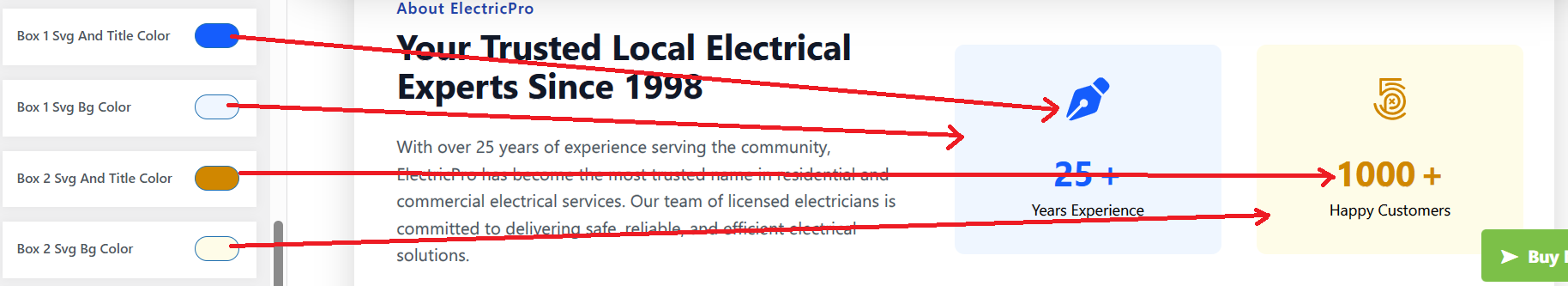 Depending on the available options in each area, you can change the color scheme for the headings, title/text, paragraphs, button text, and button background.