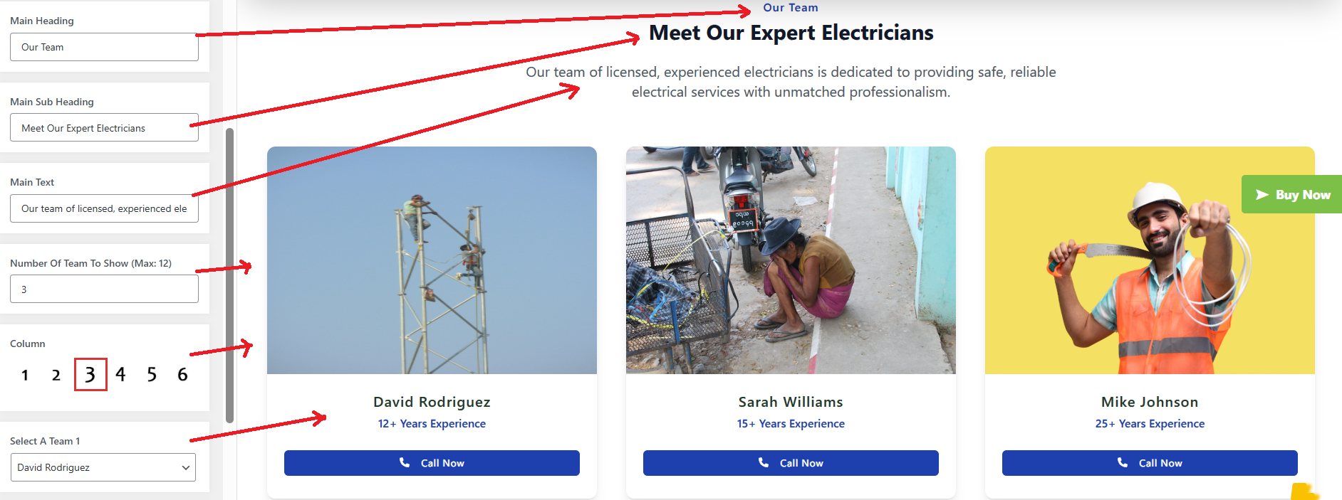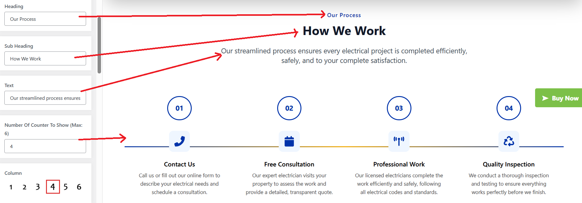 In this area, you can customize the slider's image, title, and description. You can also adjust the number of slides you want. Additionally, options are available to change the font family, font weight, font size, and colors of the headings and subheadings. You can also configure the navigation arrows and select the number of slides you prefer.